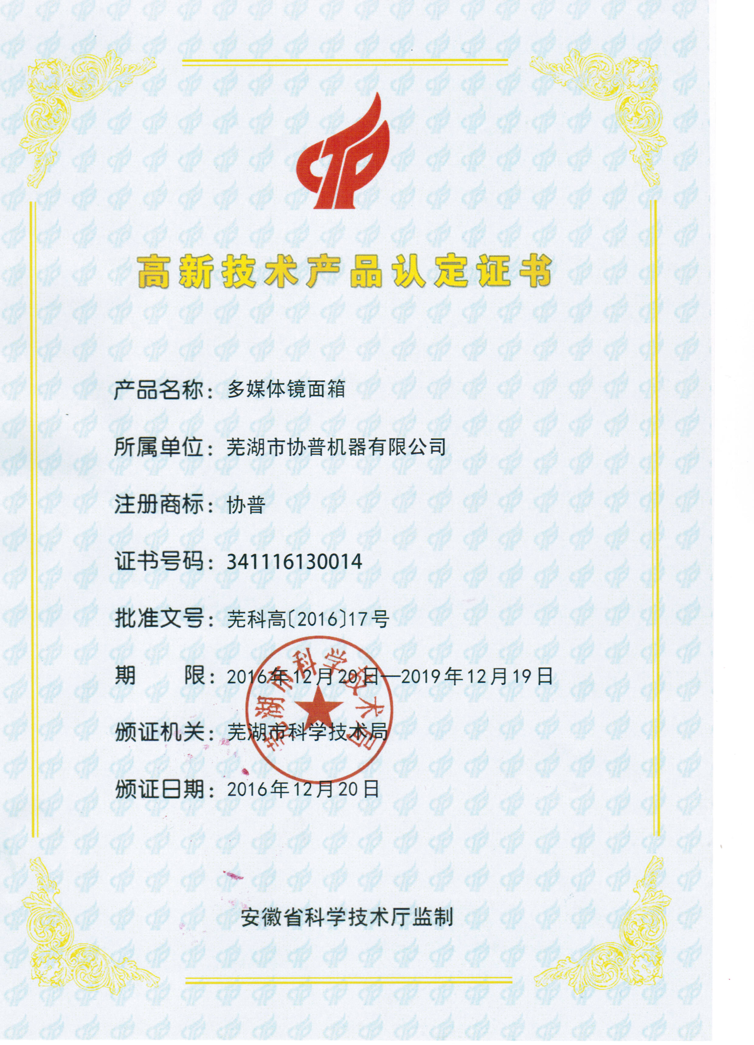 2016年9月,為提高產(chǎn)品知名度,我公司將一款新型高技術(shù)產(chǎn)品申報安徽省高新技術(shù)產(chǎn)品,經(jīng)安徽省科技廳專家評審,于2016年12月正式通過審核。