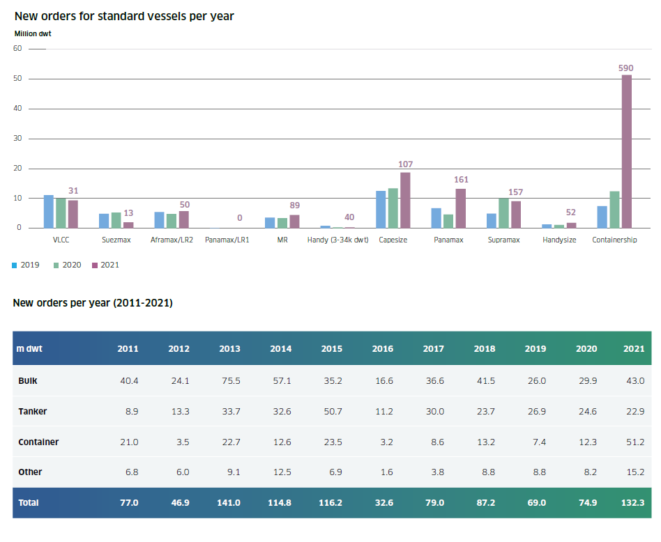 1765艘1.32萬(wàn)載重噸,2021年新船訂單量創(chuàng)10年來(lái)次高