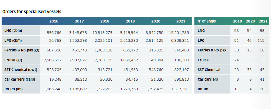 同時(shí),去年除郵輪外的特種船市場(chǎng)表現(xiàn)十分活躍。2021年LNG船新船訂單量達(dá)到98艘1520萬(wàn)立方米,其中12艘為L(zhǎng)NG加注船。LPG船訂單量也達(dá)到了創(chuàng)紀(jì)錄的135艘。不銹鋼化學(xué)品船和汽車運(yùn)輸訂單量均高于前幾年,而郵輪訂單幾乎消失。