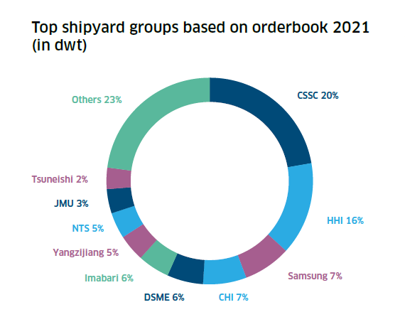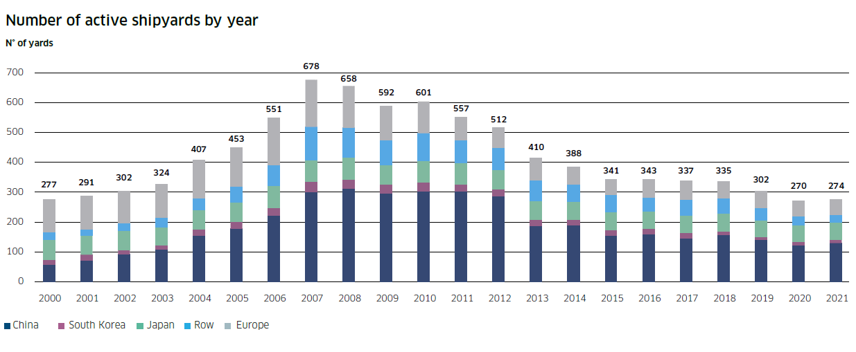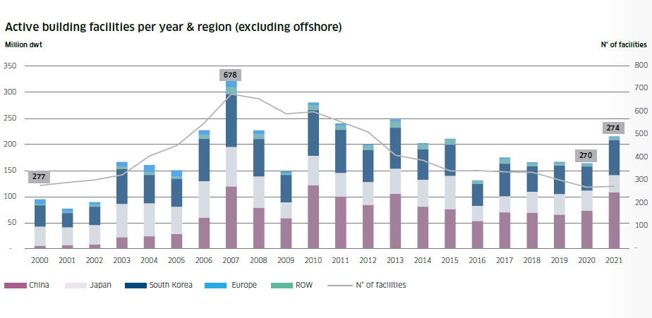 目前,全球活躍船廠(年內(nèi)接獲新訂單和/或交付新船的船廠)數(shù)量為274家,比2020年增加了4家,但僅為2007年最高約700家的40%左右。截止2021年底,全球手持訂單量從2020年底的1.8億載重噸(2003年以來(lái)最低數(shù)字)增至2.23億載重噸。