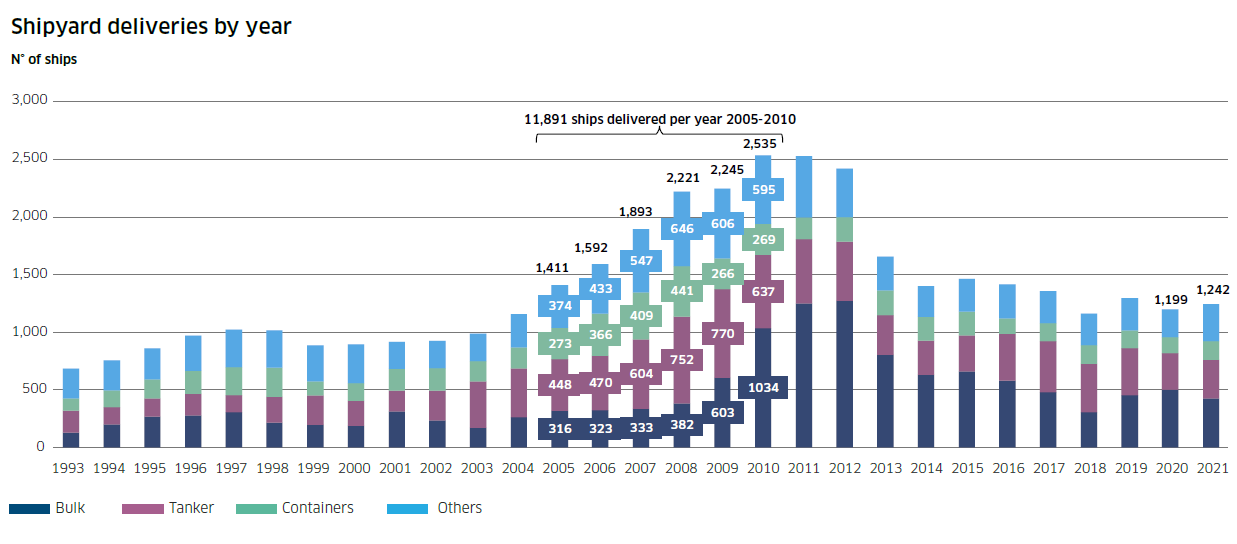 首先,全球造船廠數(shù)量已經(jīng)從2007年的約700家將至目前約300家,在此過(guò)程中全球造船產(chǎn)能收縮,目前全球每年能夠建造和交付約1200-1300艘船,遠(yuǎn)低于2005-2010年間平均約2000艘的產(chǎn)能水平。