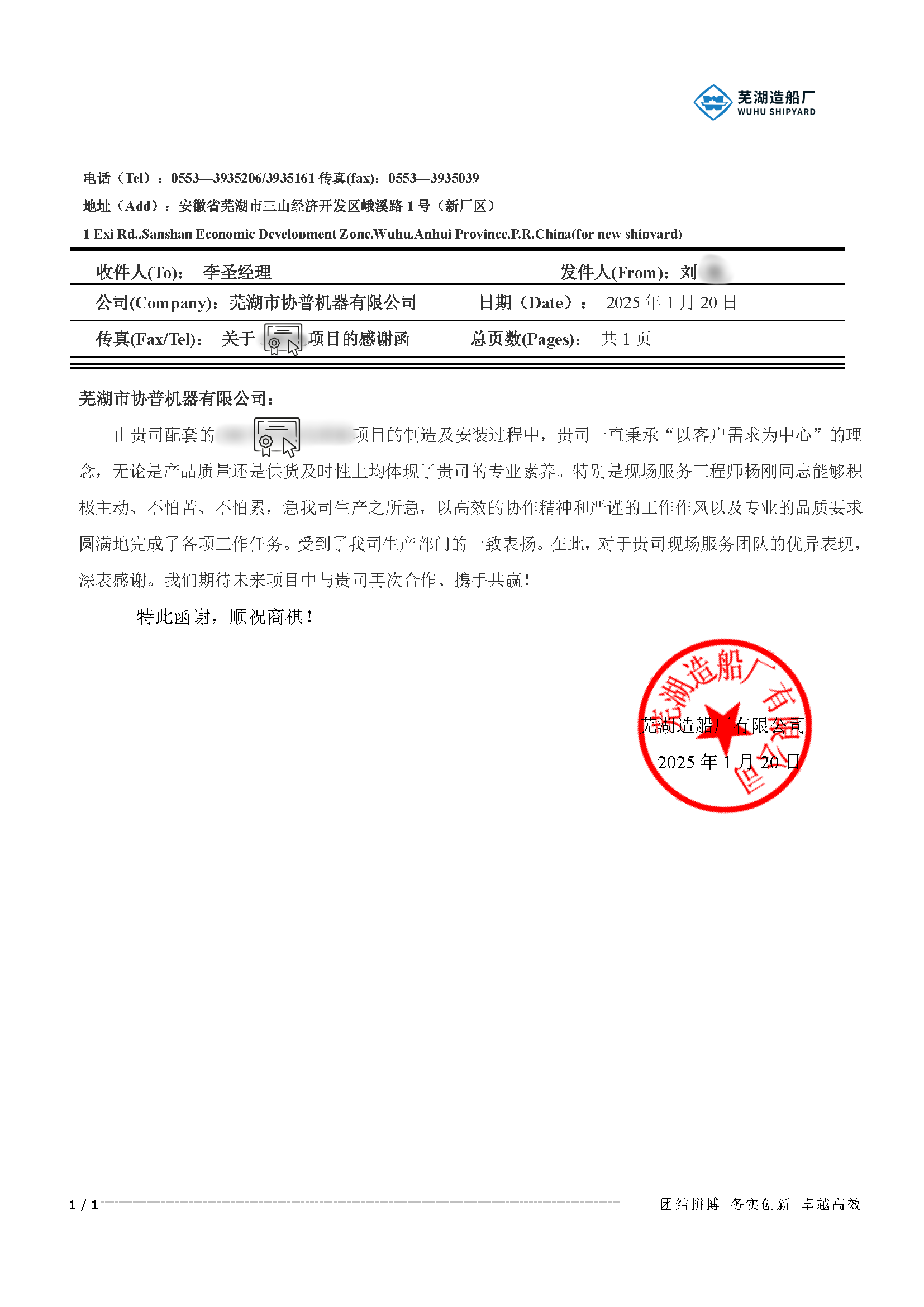 2025年,協(xié)普在給蕪湖船廠配套項(xiàng)目的制造及安裝過程中,一直秉承“以客戶需求為中心”的理念,無論是產(chǎn)品質(zhì)量、還是供貨及時(shí)性以及現(xiàn)場的服務(wù)均受到了蕪湖造船廠的高度認(rèn)可。協(xié)普?qǐng)F(tuán)隊(duì),以高效的協(xié)作精神和嚴(yán)謹(jǐn)?shù)墓ぷ髯黠L(fēng)以及專業(yè)的品質(zhì)要求圓滿地完成了各項(xiàng)工作任務(wù)。受到了蕪湖造船廠生產(chǎn)部門的一致表揚(yáng)。